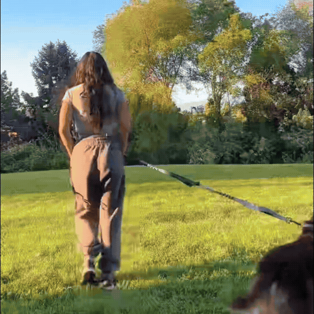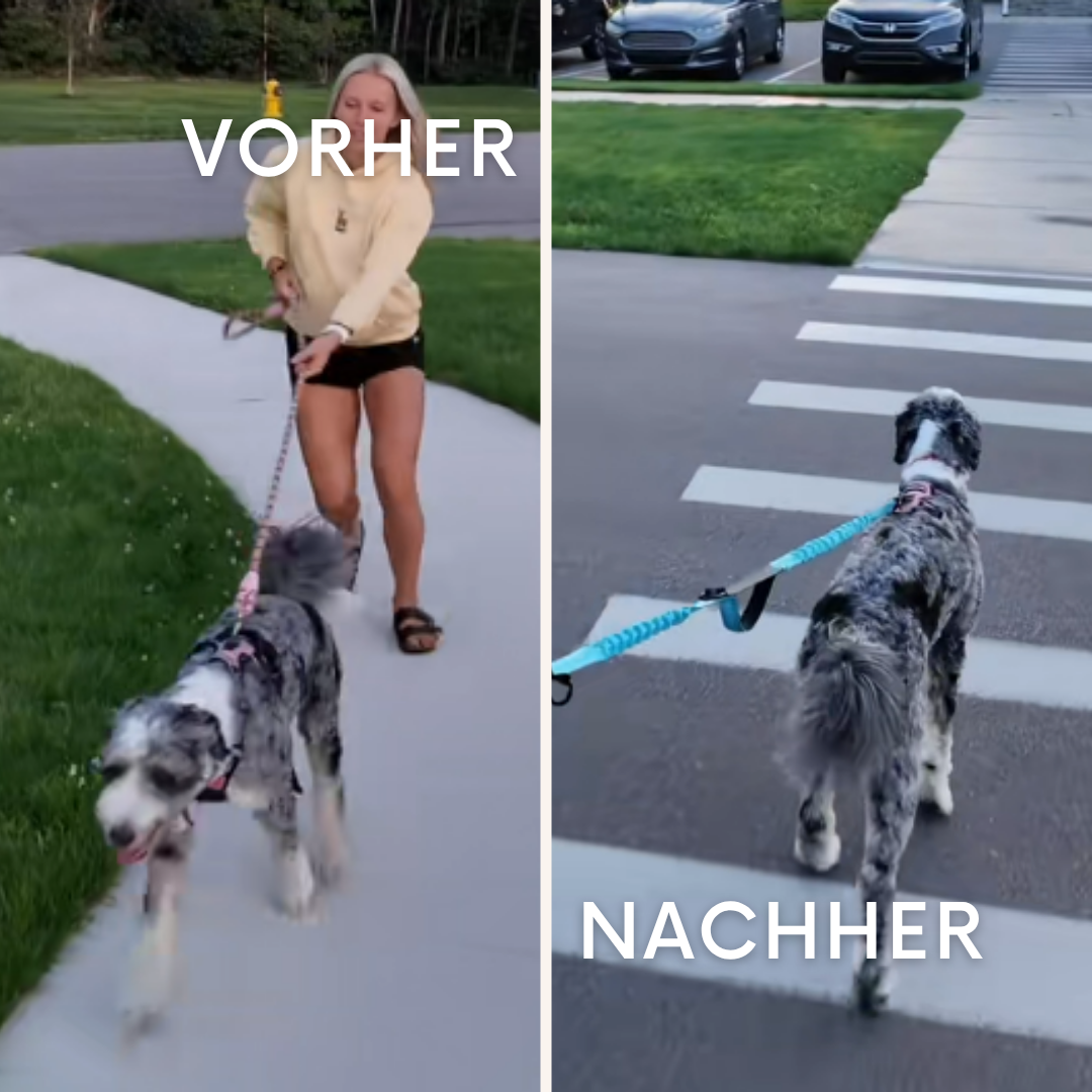 Die Leine gibt bei Zug leicht nach und fängt die plötzlichen Bewegungen deines Hundes elastisch auf. Kein harter Ruck mehr, der dir durch Rücken oder Hüfte schießt. Stattdessen spürst du eine federnde Verbindung kontrolliert, weich, sicher. So kannst du dich wieder frei bewegen, ohne ständig auf der Hut zu sein.
